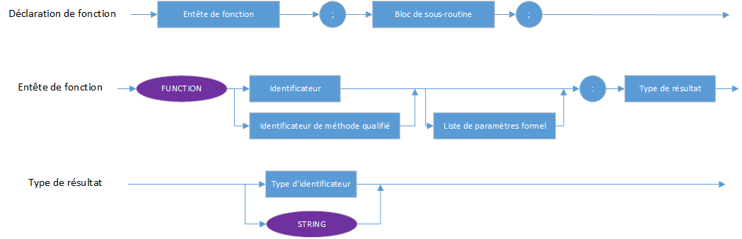 L'entête de la fonction spécifie l'identificateur de la fonction, les paramètres formels (le cas échéant) et le type de résultat de la fonction. Une fonction est activée par l'évaluation d'un appel de fonction. L'appel de fonction donne l'identificateur de la fonction et les paramètres réels, le cas échéant, requis par la fonction. Un appel de fonction apparaît comme un opérande dans une expression. Lorsque l'expression est évaluée, la fonction est exécutée et la valeur de l'opérande devient la valeur renvoyée par la fonction. La partie instruction du bloc de la fonction spécifie les instructions à exécuter lors de l'activation de la fonction. Le bloc doit contenir au moins une instruction d'affectation affectant une valeur à l'identificateur de fonction. Le résultat de la fonction est la dernière valeur attribuée. Si aucune instruction d'affectation n'existe ou si elle n'est pas exécutée, la valeur renvoyée par la fonction est indéfinie. Si l'identificateur de la fonction est utilisé dans un appel de fonction au sein du bloc de la fonction, la fonction est exécutée de manière récursive. Voici des exemples de déclarations de fonction :