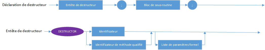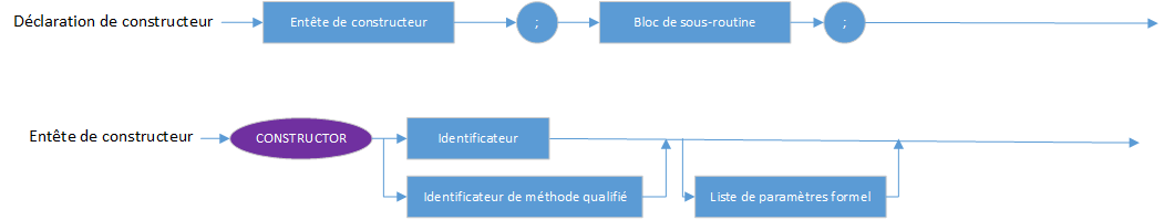 Pour les méthodes constructeur et les méthodes destructrices, la déclaration de définition prend la forme d'une déclaration de méthode de procédure, sauf que le mot réservé PROCEDURE est remplacé par un mot réservé CONSTRUCTOR ou DESTRUCTOR.