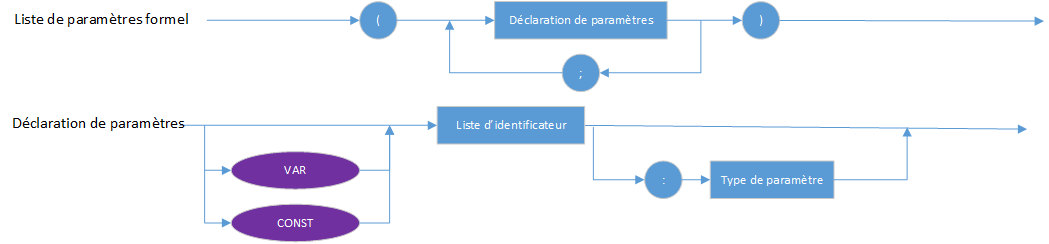 - Un groupe de paramètres sans VAR précédent et suivi d'un type est une liste de paramètres de valeur.