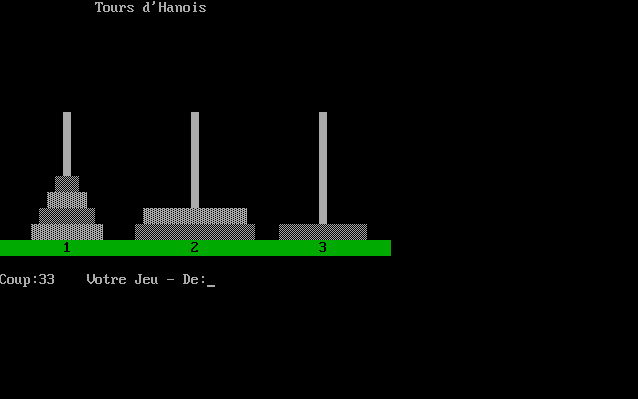L'exemple de jeu Tours d'Hanois suivant est développé en Turbo Pascal 7 et fonctionne également sous Free Pascal. Voici le code source en Turbo Pascal du jeu :