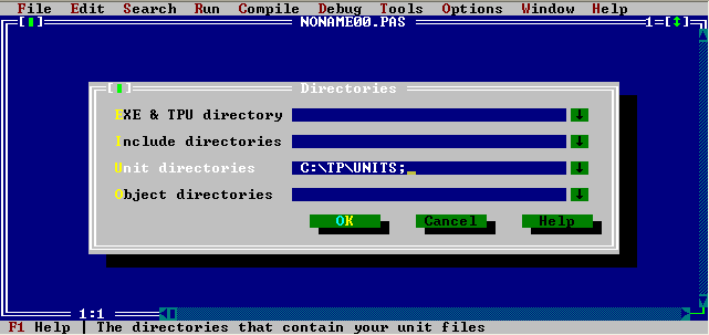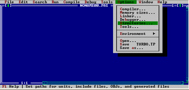 - Sous Turbo Pascal, le compilateur recherche dans le répertoire courant et dans les répertoires spécifiés dans les répertoires Options|Directories... :