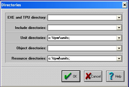 - Sous Turbo Pascal for Windows, le compilateur recherche dans le répertoire courant et dans les répertoires spécifiés dans les répertoires Options|Directories... :