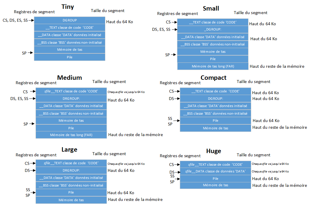 Le schéma suivant montrent comment la mémoire du 8086 est répartie pour les six modèles de mémoire du Turbo C :