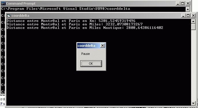 ConsolePrint ("Distance entre Montréal et Paris en Km: " &CStr(CoordToDeltaKm(45, 31, "N", 73, 34, "O", 48, 50, "N", 2, 20, "E")) &vbCrLf)