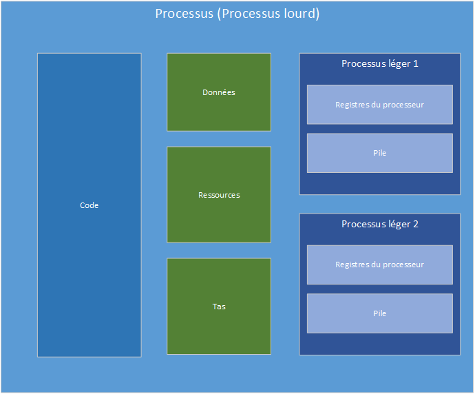 Cette expression permet d'indiquer une suite d'exécution d'instruction avec un délai de traitement relativement court ayant pour but de fournir un service à un processus, un programme ou un service. Les processus léger sont généralement beaucoup plus nombreux que les processus et que les programmes et son souvent perçus comme un sous-ensemble d'un processus. Un processus léger possédera également sa propre pile d'exécution, son propre compteur de programme et utilisera généralement les API du système d'exploitation ou des appels au système pour communiquer. Un processus léger peut partager ses variables et sa mémoire dynamique avec un autre processus léger géré par le même processus. Ainsi, la programmation des variables partagé est beaucoup plus délicate à programmer. Un processus léger est synonyme de thread en anglais.