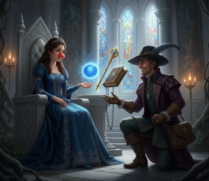Cet homme qui se faisait appeler docteur n'était pourtant ni guérisseur ni savant. Voyageur rusé, nourri de ruses et d'ambitions secrètes, il parcourait les royaumes à la recherche d'occasions rares, là où la magie et le désespoir se croisaient. Ce qu'il convoitait n'était pas la reconnaissance ni l'or, mais les objets enchantés dont il connaissait la valeur et le pouvoir. Il avait entendu parler de trois reliques anciennes, gardées au palais, capables d'exaucer les voeux et de soumettre les hommes à la volonté de celui qui les possédait. La princesse, frappée par le sort, n'était pour lui qu'un passage obligé, une clé fragile ouvrant la porte à ces trésors. Sous son masque de bienveillance, il n'abritait qu'un calcul froid : guérir, oui... mais seulement si le prix en valait la peine.