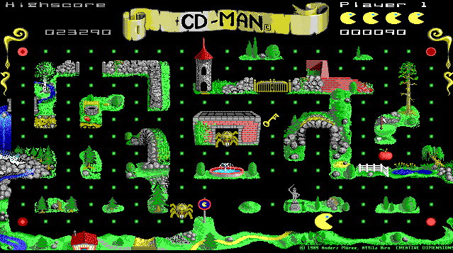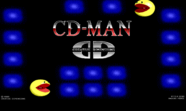 Le jeu CD-Man est une variante de Pac-man, lequel se retrouve une nouvelle forme dans ce clone très mignon. Le CD-Man propose 5 mondes différents à traverser, chacun ayant des graphismes joliment dessinés en mode EGA haute résolution et donc un nouveau personnage, 'The Snoofer'. Le jeu a été créé par deux auteurs suédois, Atilla Biro et Anders Moree