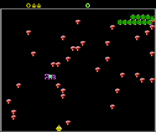 Si le mille-pattes atteint le bas de l'écran, il se déplace d'avant en arrière dans la zone du lecteur et des mille-pattes à un segment sont ajoutés périodiquement. Cela continue jusqu'à ce que le joueur ait éliminé à la fois le mille-pattes d'origine et toutes les têtes. Lorsque tous les segments du mille-pattes sont détruits, un nouveau mille-pattes se forme en haut de l'écran. Cependant, chaque fois qu'un mille-pattes est éliminé, le suivant est plus court d'un segment et s'accompagne d'un mille-pattes supplémentaire se déplaçant rapidement. Un joueur perd une vie lorsqu'il est touché par un mille-pattes ou un autre ennemi, comme une araignée ou une puce, ce qui fait que le jeu transforme tous les champignons empoisonnés ou partiellement endommagés en champignons entiers normaux. Des points sont attribués pour chacun de ces champignons après que le joueur a perdu une vie. La puce laisse des champignons derrière elle lorsque moins de cinq sont dans la zone du joueur, bien que le nombre requis augmente avec le niveau de difficulté. Les araignées se déplacent dans la zone du joueur en zigzag et mangent parfois des champignons.