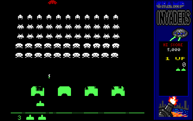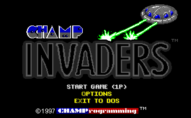 Le jeu CHAMP Invaders est un remake de shareware DOS de la machine d'arcade classique Space Invaders. Comme les autres jeux de la série de remakes d'arcade de CHAMProgramming, il émule étroitement l'original avec trois modes de jeu : le mode 'Classique' original, le mode 'Deluxe' et le mode 'Champ' amélioré. Le mode "Classic" ressemble beaucoup à la machine d'arcade, avec des graphismes, un son et une façon de jouer très similaires - se déplaçant à gauche et à droite en bas de l'écran, tirant sur un tas de méchantes bombes extraterrestres, protégées par trois rapidement boucliers dégradants... Vous le savez, ou devriez-vous le savoir !