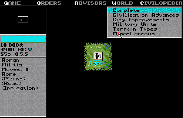 Le jeu Civilization est un jeu vidéo de stratégie au tour par tour de type «4X» créé par Sid Meier et Bruce Shelley pour MicroProse en 1991. L'objectif du jeu est de «Construire un empire pour résister à l'épreuve du temps» : il commence en 4000 avant-Jésus-Christ et les joueurs tentent d'étendre et de développer leurs empires à travers les âges, de l'ère ancienne jusqu'à l'époque moderne et proche du futur. Il est également connu simplement sous le nom de Civilization a été développé à l'origine pour DOS fonctionnant sur un PC.