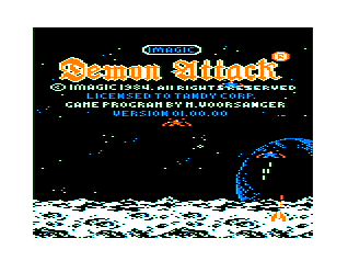 Le jeu Demon Attack était le jeu Atari 2600 le plus populaire d'Imagic et a été porté sur à peu près toutes les grandes plateformes au début des années 1980. C'était un shoot them up basique dans l'espace, avec des effets innovants pour l'époque (les démons «implosent» sur l'écran). Dans les niveaux ultérieurs, les démons tirent au laser et frapper les démons les divisera en plus petits. Il y a aussi un gros vaisseau-mère à attaquer, similaire à la dernière étape du jeu d'arcade Phoenix (ou la version Coco de Demon Seed). Pour chaque vague, le démon change également d'apparence.