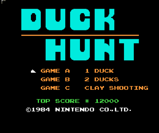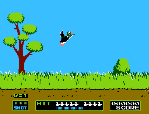 Le jeu Duck Hunt est un jeu vidéo de tir au pistolet léger de 1984 développé et publié par Nintendo pour la console de jeu vidéo NES (Nintendo Entertainment System). Le jeu est sorti pour la première fois au Japon en avril 1984, et est sorti en tant que jeu de lancement pour la NES en Amérique du Nord en octobre 1985, avant de sortir également en Europe deux ans plus tard. Dans Duck Hunt, les joueurs utilisent le NES Zapper en combinaison avec un téléviseur CRT pour filmer les canards apparaissant à l'écran. Les canards apparaissent un ou deux à la fois et le joueur reçoit trois coups pour les abattre. Le joueur reçoit des points en tirant sur chaque canard. Si le joueur tire le nombre requis de canards en un seul tour, le joueur passera au tour suivant ; sinon, la partie est terminé.