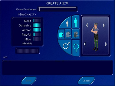 Le jeu The Sims est un jeu de simulation de la vie quotidienne. Les joueurs commencent par créer des familles de Sims, construisent leurs maisons, puis jouent un rôle dans la direction (ou la mauvaise direction) de leur vie. Les joueurs doivent définir la personnalité de chaque Sim au charabia en pondérant soigneusement les traits de personnalité donnés (y compris des éléments tels que), choisir leurs «skins», puis construire une maison pour leur nouvelle famille avec un fonds de démarrage de base. Gagner plus d'argent est naturellement crucial pour la survie, et bien que les joueurs ne puissent jamais jeter un coup d'oeil sur le lieu de travail de leur Sim employé, ils s'occuperont de ceux restant à la maison pendant l'absence de leur Sim travaillant. Toutes les tâches banales de la vie quotidienne doivent être traitées - guider les Sims à se laver, aller au petit pot, préparer la nourriture, nouer des amitiés, regarder la télévision, sortir les poubelles, aller au lit,...