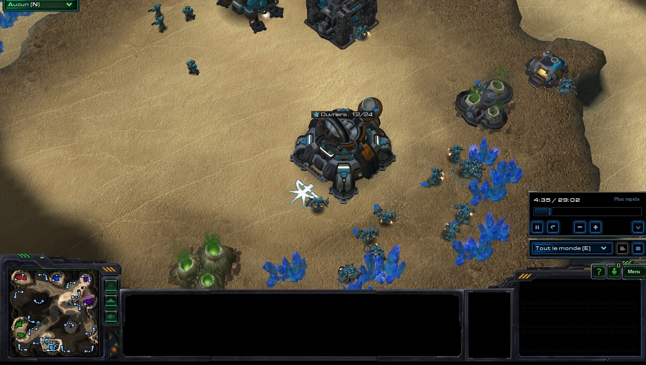 - Envoyez quelques éclaireurs bon marché (Zerglings ou même Drones) pour avoir un aperçu de la route. Essayez de localiser de nouvelles ressources (champs de minéraux et geysers de Verspene) ainsi que des bases et des déploiements ennemis.