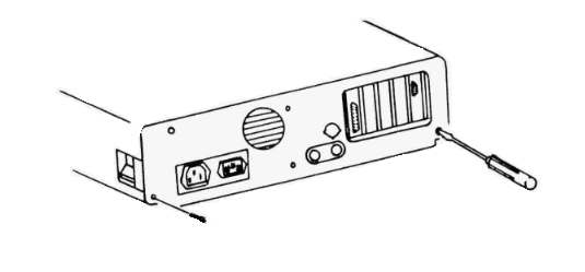 - A l'aide du tournevis (ou tournevis 1/4"), retirez les 5 vis de fixation du capot à l'arrière de l'ordinateur (veillez à ranger les vis en lieu sûr).