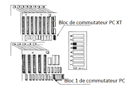 - À l'aide du schéma ci-dessous, localisez le bloc de commutation 1. Si vous avez un PC/XT, vous remarquerez qu'il n'a qu'un seul bloc de commutation.