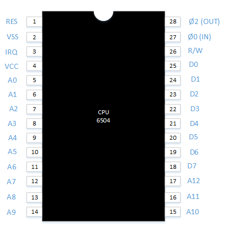 Voici le schéma des broches de la puce 6504 de l'entreprise MOS Technology :
