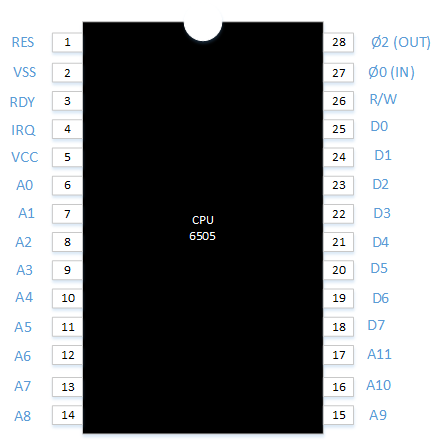 Le microprocesseur 6505 de l'entreprise MOS Technology est un microprocesseur peut cher à produire sur 28 broches.