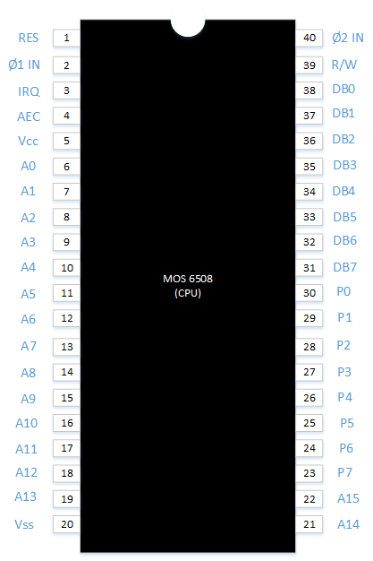 Voici le schéma des broches de la puce 6508 de l'entreprise MOS Technology :