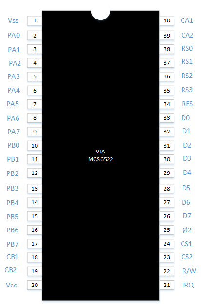 Voici le schéma des broches de la puce 6522 de l'entreprise MOS Technology :
