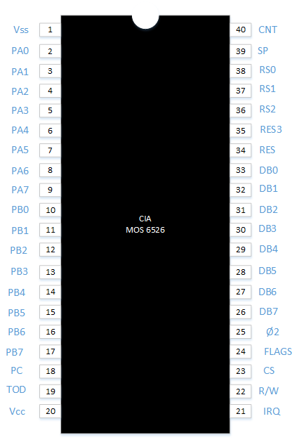 Voici le schéma des broches de la puce 6526 de l'entreprise MOS Technology :