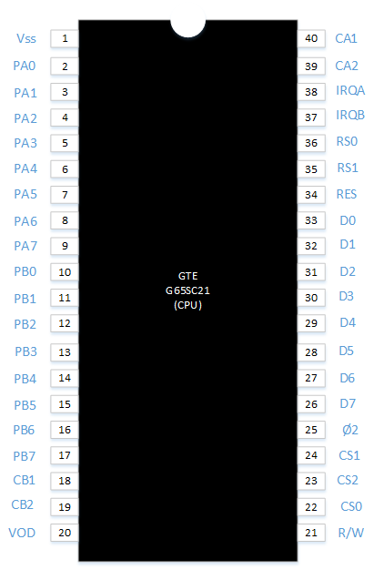 La puce G65SC21 de l'entreprise GTE est un adaptateur d'interface périphérique très flexible à utiliser avec les familles de microprocesseurs GTE et 8 bits. Le G65SC21 fournit un contrôle par microprocesseur programmé de jusqu'à 2 périphériques (Port A et Port B). Le contrôle des périphériques est effectué via 2 ports d'entrée/sortie bidirectionnels 8 bits, avec des registres de direction des données assignés individuellement. Les registres de direction des données permettent la sélection du sens du flux de données (entrée ou sortie) à chaque port d'entrée/sortie respectif. La direction du flux de données peut être sélectionnée ligne par ligne avec des lignes d'entrée et de sortie mélangées dans le même port. La fonction de contrôle d'interruption "handshake" est fournie par 4 lignes de contrôle périphériques. Cette fonctionnalité a permis de mieux contrôler les fonctions de transfert de données entre le microprocesseur et les périphériques, ainsi que le transfert de données bidirectionnel entre les adaptateurs d'interface périphérique G65SC1 dans les systèmes multiprocesseurs.