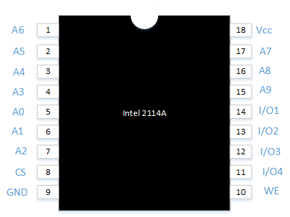 Voici le schéma des broches de la puce 2114A de l'entreprise Intel :