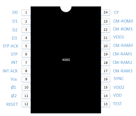 Voici le schéma des broches de la puce 4040 de l'entreprise Intel :