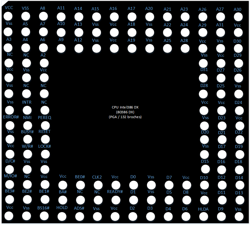 Voici le schéma des broches de la puce 80386DX de l'entreprise Intel :