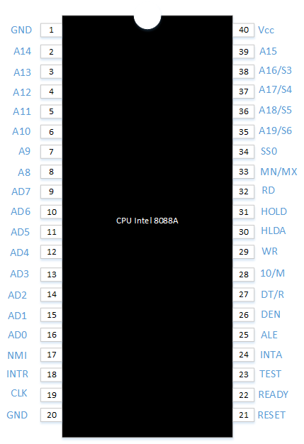 Voici le schéma des broches de la puce 8088A de l'entreprise Intel :