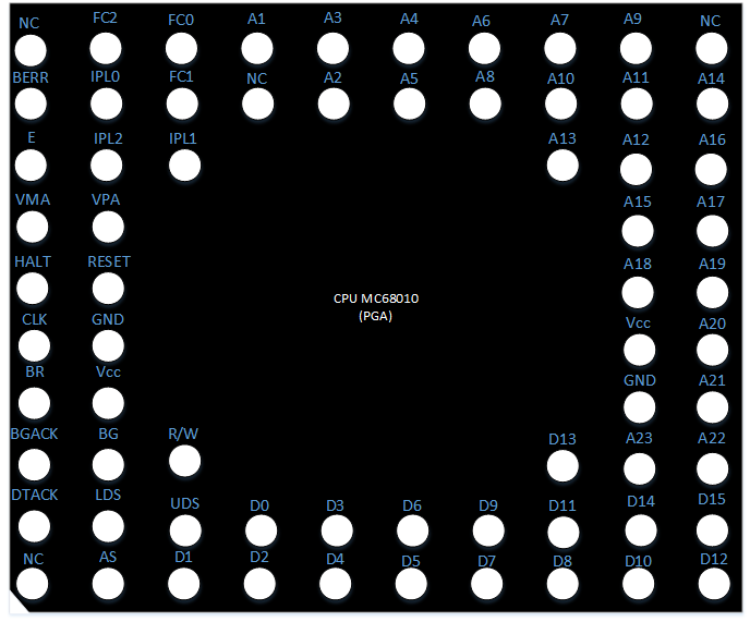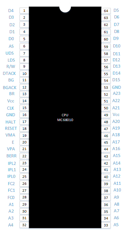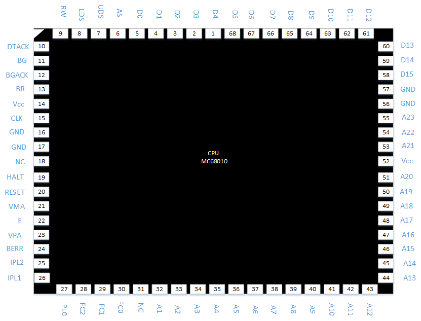 Voici le schéma des broches de la puce MC68010 de l'entreprise Motorola :