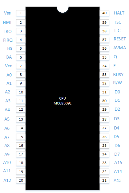 Voici le schéma des broches de la puce MC68B09E de l'entreprise Motorola :