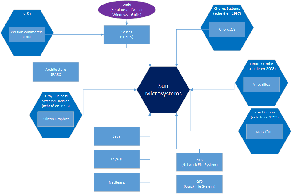 L'entreprise Sun Microsystems a été fondé en 1982 par Andy Bechtolsheim, Bill Joy, Vinod Khosla et Scott McNealy. Elle se voulait une entreprise innovante offrant des postes de travail ou des serveurs avec un systèmes d'exploitation Solaris (SunOS). Durant son parcours, l'entreprise inventa la NFS (Network File System) et le langage de programmation Java. Elle fit l'acquisition des logiciels StarOffice, VirtualBox, MySQL. En 2009, Oracle acheta l'entreprise pour un montant de 13,8 milliard de dollars.