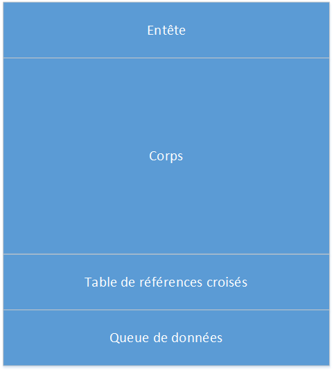 - Queue de données : Une queue de données donnant l'emplacement de la table de correspondance et de certains objets spéciaux dans le corps du fichier.