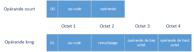Chaque opération est identifiée par un op-code de 8 bits et peut avoir un ou plusieurs opérandes. Les opérations sur un seul opérande tiennent dans un seul mot de 16 bits si la valeur de l'opérande est inférieure à 256. Pour que les valeurs des opérandes ne soient pas limitées à l'intervalle de 0 à 255, chaque opération a une longue variante, dans laquelle l'octet suivant l'op-code est ignoré et le mot suivant est considéré comme une quantité de 16 bits. La variante longue d'un op-code est indiquée en définissant le bit 0x40 dans l'op-code (cela permet 64 op-codes, dont 6 ont été utilisés jusqu'à présent.) Les deux formats d'opérandes simples sont présenter ici :