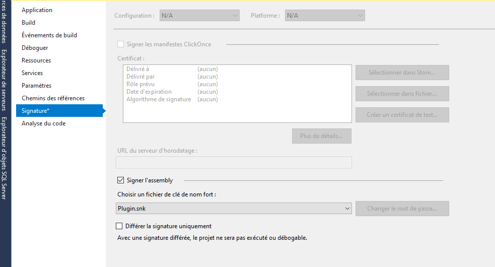 - On peut généralement utilisé un fichier .SNK dans Visual Studio en allant dans les Propriétés d'un projet, dans l'onglet «Signature» :
