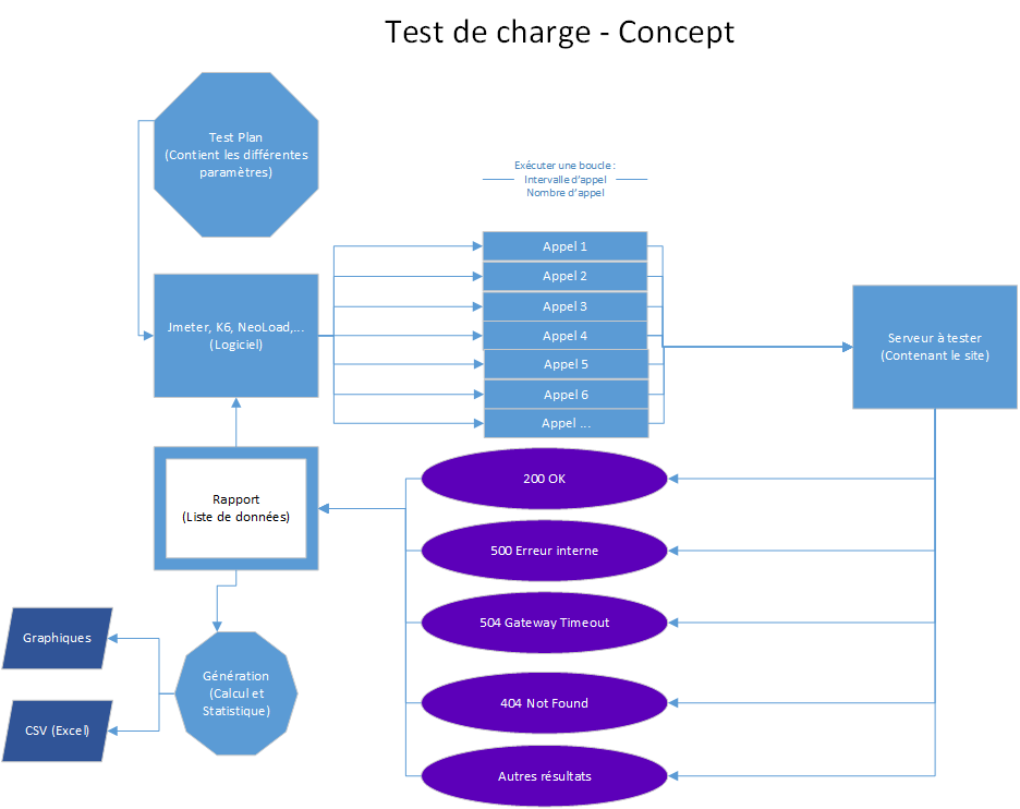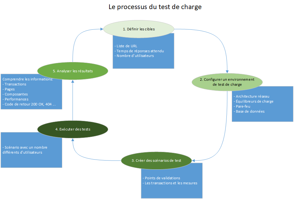 Un processus de test de charge se divise généralement en 5 étapes : Définir les cibles, configurer un environnement de test de charge, créer des scénarios de test, exécuter des tests et analyser le résultat.