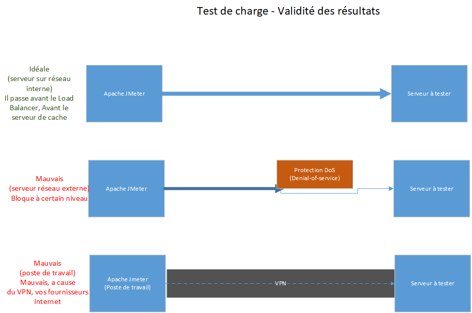 Pour avoir un test de charge avec des données valides, il est important d'effectuer des tests de charge dans un environnement avec le moins d'intervenant possible. Ainsi, il est important de s'assurer qu'il faut par exemple éviter de passer par un VPN si le site réel ne passe pas par un VPN, car le test de charge pourrait démontrer que le site ne fournit pas ou n'est pas assez solide quand on fait, le problème viendrait du fait que le VPN ne supporte pas une pleine capacité de transmission comme un réseau Internet. DE plus, il est préférable de faire les tests en réseau interne plutôt qu'en réseau externe, car si vous appeler de l'extérieur et que votre réseau est protégé contre les DoS (Denial-of-Service), les résultats sera encore faussé à cause qu'il n'accepte pas assez d'appel en provenance d'une même source et non pas à cause que le serveur ne répond plus.