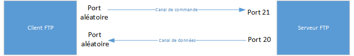 - Le serveur se connecte du port 20 au port client désigné pour le canal de données. Une fois la connexion de données établie, les transferts de fichiers sont ensuite effectués via ces ports client et serveur.