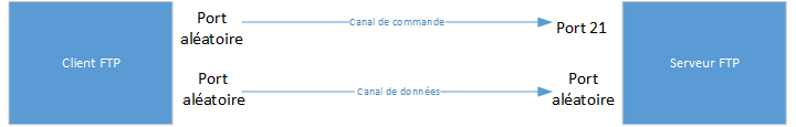 - Le client se connecte depuis un autre port aléatoire au port aléatoire spécifié dans la réponse du serveur. Une fois la connexion établie, les transferts de données sont effectués via ces ports client et serveur.