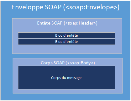 Un message SOAP se compose d'une enveloppe contenant un entête en option et un corps requis, comme le montre l'image suivante :