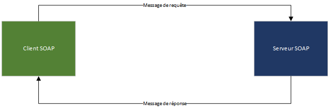 Ainsi, d'un côté une requête (le client envoie des informations d'appel de fonction au serveur) et de l'autre, la réponse (le serveur renvoie la valeur de retour(s) au client). Le SOAP ne nécessite pas que chaque requête ait une réponse, ou vice versa, mais il est courant de voir l'appariement de requête-réponse.