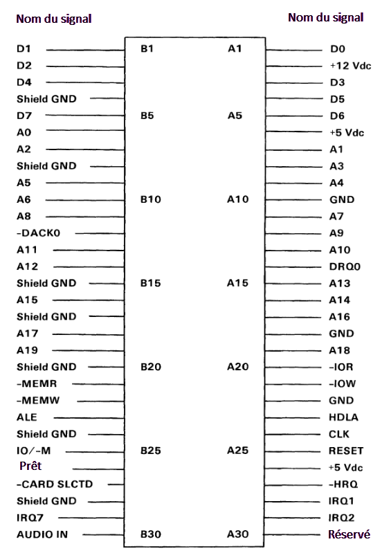 Le canal d'entrée/sortie (E/S) est une extension du bus du microprocesseur 8088. Il est cependant démultiplexé, réalimenté et amélioré par l'ajout d'interruptions.