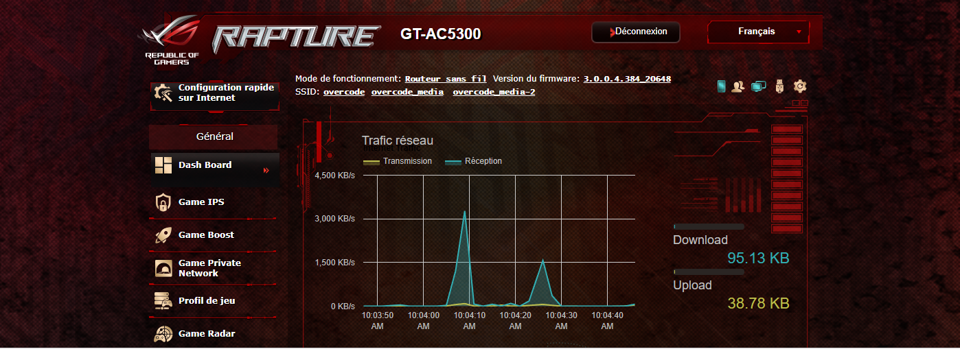 Le routeur ROG Rapture GT-AC5300 de l'entreprise ASUS un routeur pour les joueurs avec des exigences extrêmes. Par conséquent, tous les caractéristiques de se routeurs sont très impressionnantes. Le microprocesseur est une bête féroce, le nombre de port réseau est de 8 plutôt que 4, l'interface Web pour la gestion du routeurs est d'une beauté artistiques remarques plutôt que de vulgaires formulaires. L'interface Web est proposé en plusieurs langues dont le Français, les mises à jours sont automatiques. Tout est impressionnant, même la boite dans lequel il est emballé !