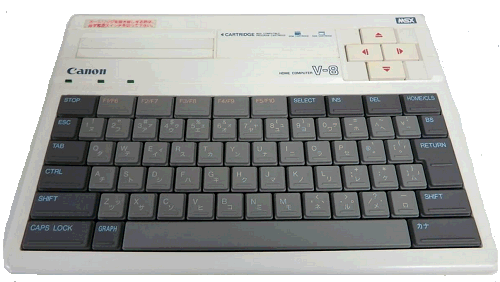 Le micro-ordinateur Canon V-8 est le plus petit ordinateur MSX commercialisé par Canon. Il n'a qu'un seul emplacement de cartouche et aucun port d'imprimante. Il est également étonnant de voir l'intégration de certains composantes dans un MSX-Engine pour un ordinateur avec seulement 16 Ko de RAM. Les touches du curseur sont situées en haut à droite du boîtier pour garder le clavier et l'ordinateur aussi compacts que possible. Sa taille est compacte mais vous devez utiliser l'adaptateur secteur externe AD-10 fourni.