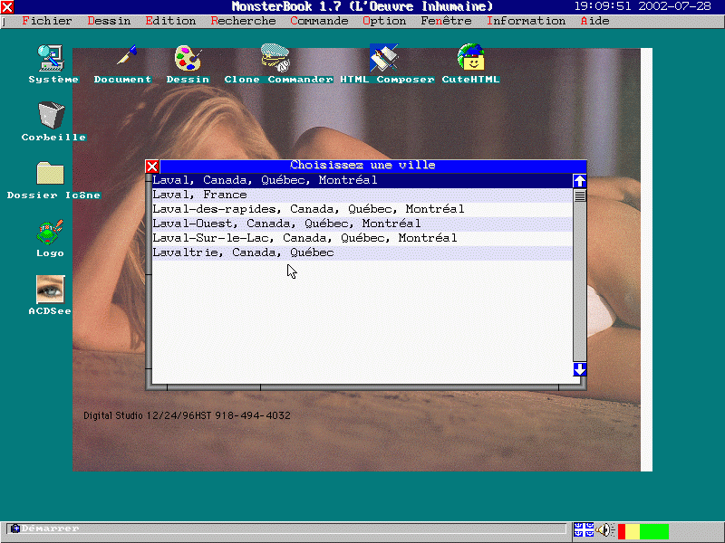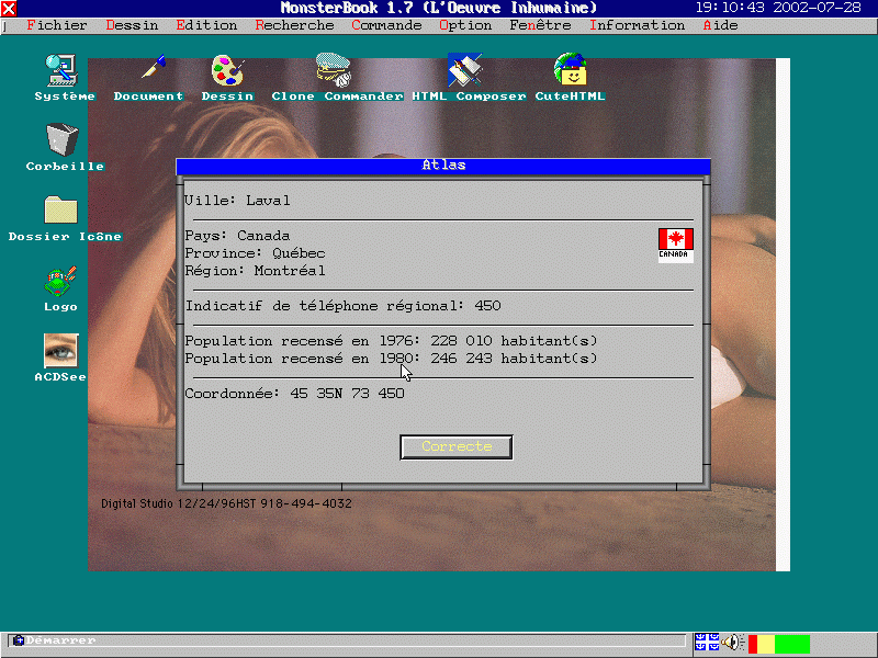 Le mini-atlas de géographie permet d'obtenir des informations supplémentaire sur une nom de ville et d'un pays. Il s'agit à l'origine d'un démonstrateur de la puissante base de données (Mentronix) inclus dans le MonsterBook à partir de la version 1.6. Les données sont toutefois autant réel que possible (l'erreur d'entrée de données n'étant hélas pas impossible). Cependant, il pourra sûrement aider certaines personnes à consulter de l'information facilement sur des villes principalement situé au Québec.