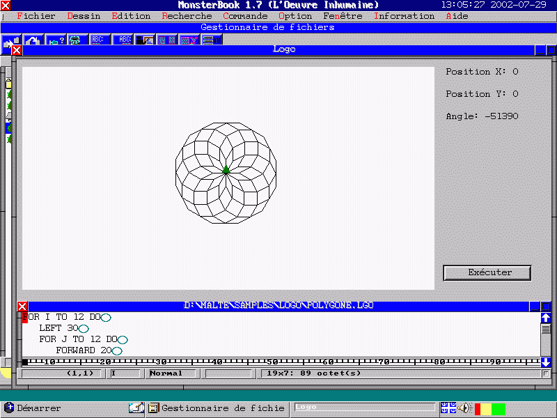 Il est a noter que dans le répertoire «SAMPLES\LOGO» un petit groupe de programme LOGO démonstrateur peuvent être consulter afin de vous aidez à mieux comprendre le fonctionnement de ce langage sous le MonsterBook.