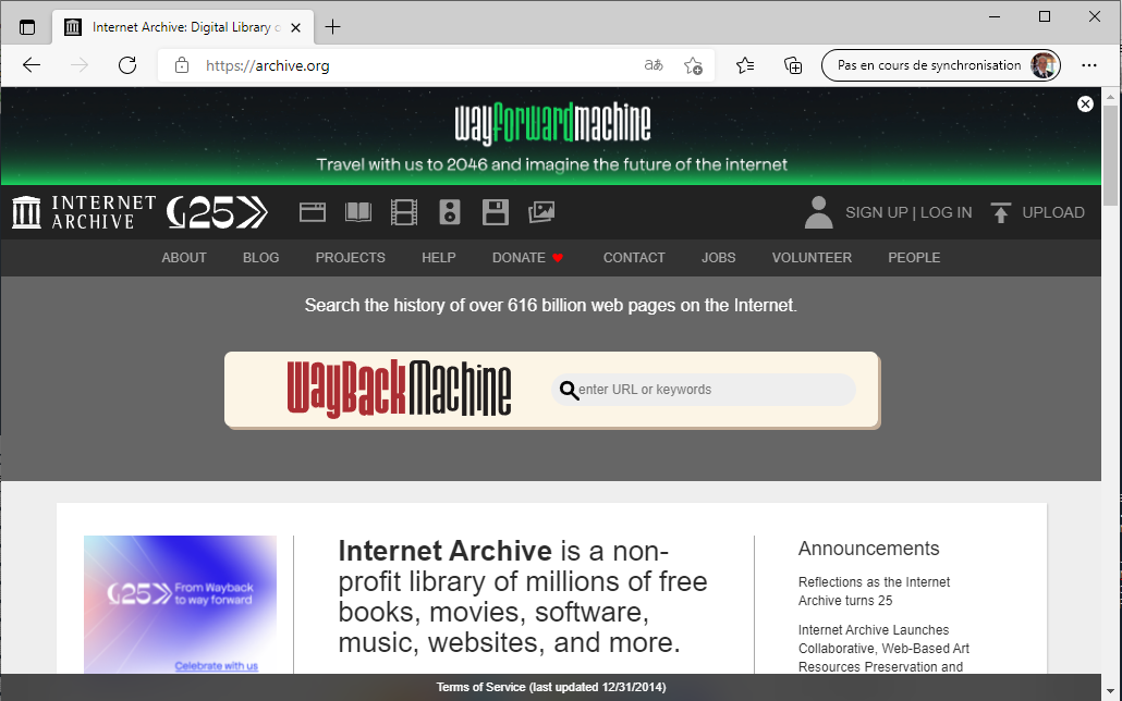 L'organisme Internet Archive, aussi nommé archive.org, est dédié au suivi et à la documentation de l'historique des différentes pages Internet. Il enregistre l'évolution des pages Internet depuis 1996. Vous pouvez rechercher n'importe quel site Web sur ce moteur de recherche pour voir comment il a évolué au fil du temps. Il offre également à ses utilisateurs la possibilité d'entreposer du contenu numérique sans se soucier de l'espace d'hébergement. Cette «Machine à remonter le temps» est devenue un lieu de référence de plus en plus populaire pour les citations et l'analyse historique de divers contenus numériques.