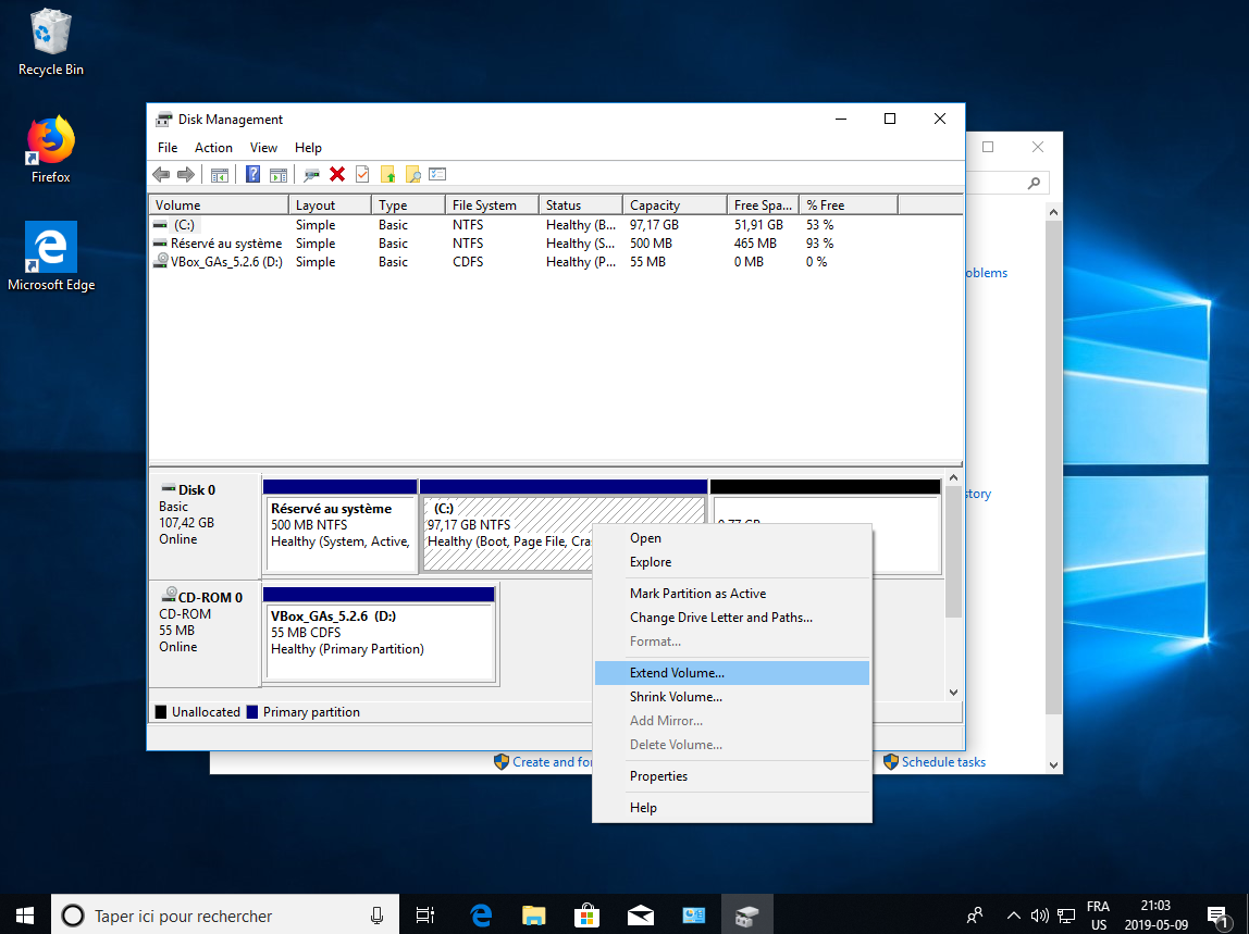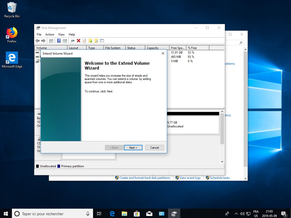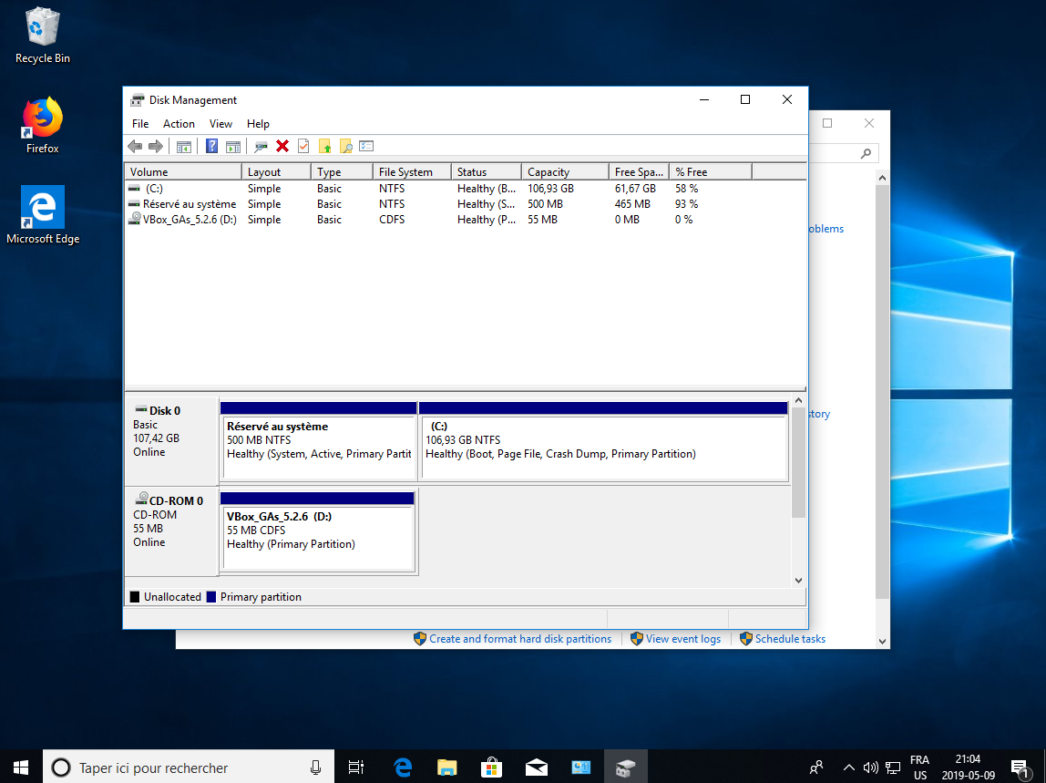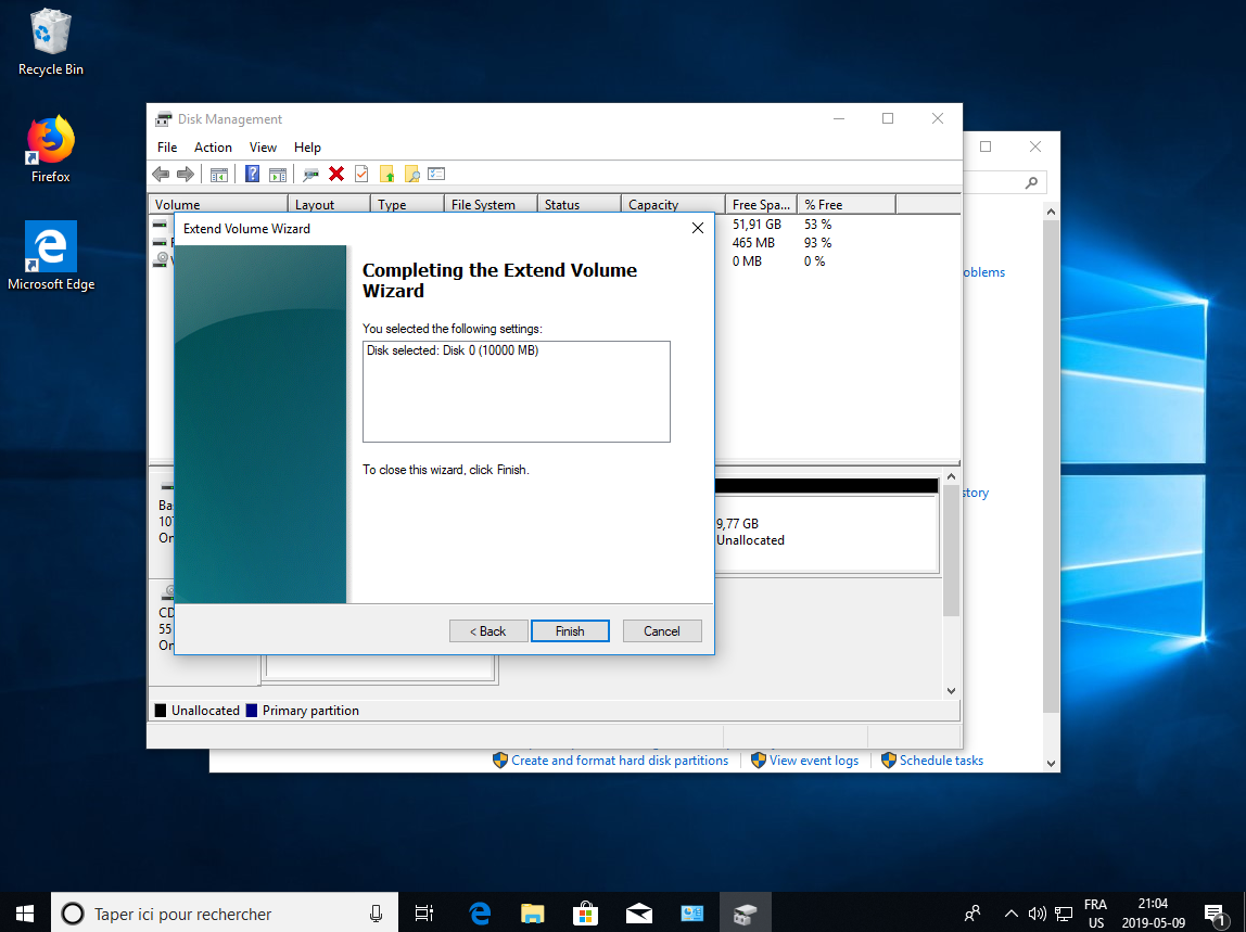 Vous constatez maintenant qu'il n'y a plus d'espace de libre grisé en noir (Unallocated) sur la partition du disque 0.