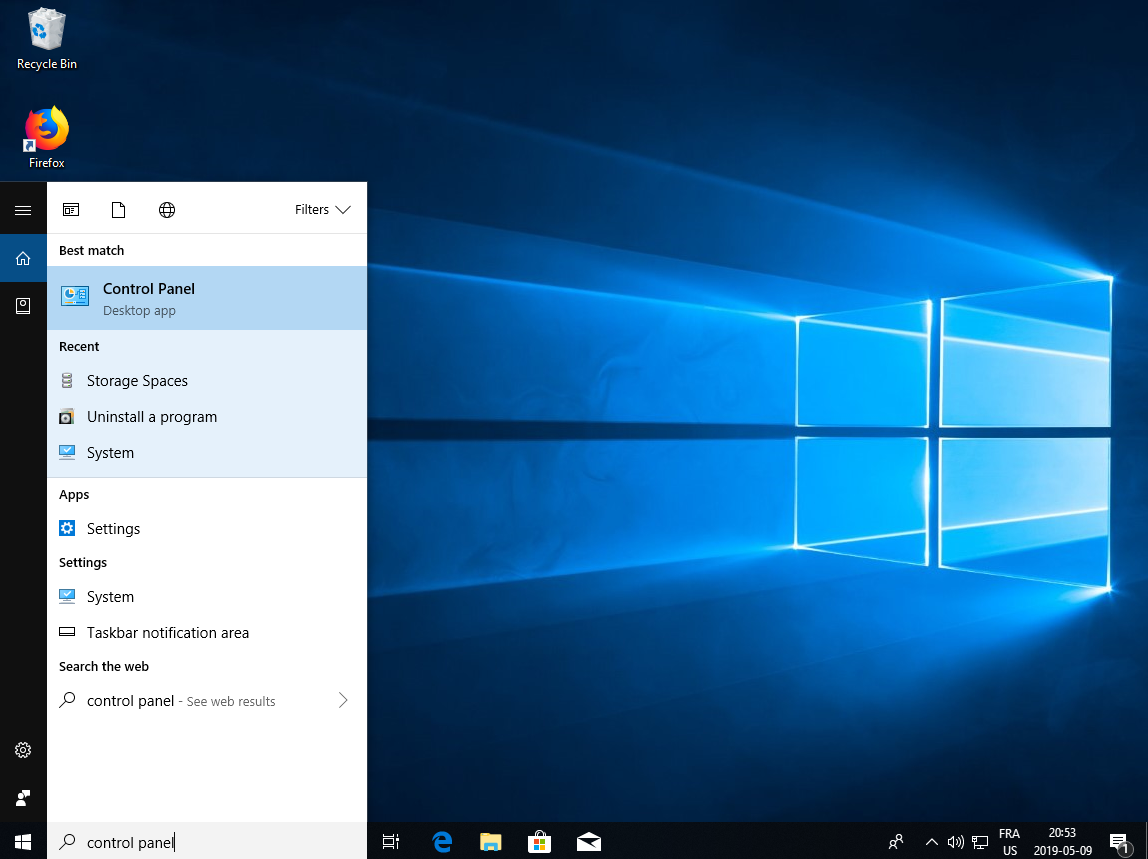 Vous écrivez «control panel» dans la zone de recherche et vous cliquez sur l'icône «Control Panel» :
